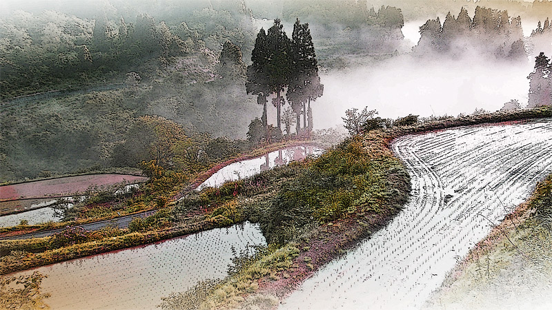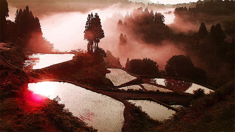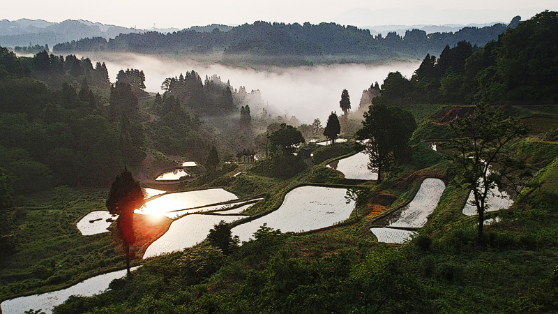 朝靄が残る夜明けと同時に新潟の棚田を見に行った時の素晴らしさ、なんとも言えない光景でした。