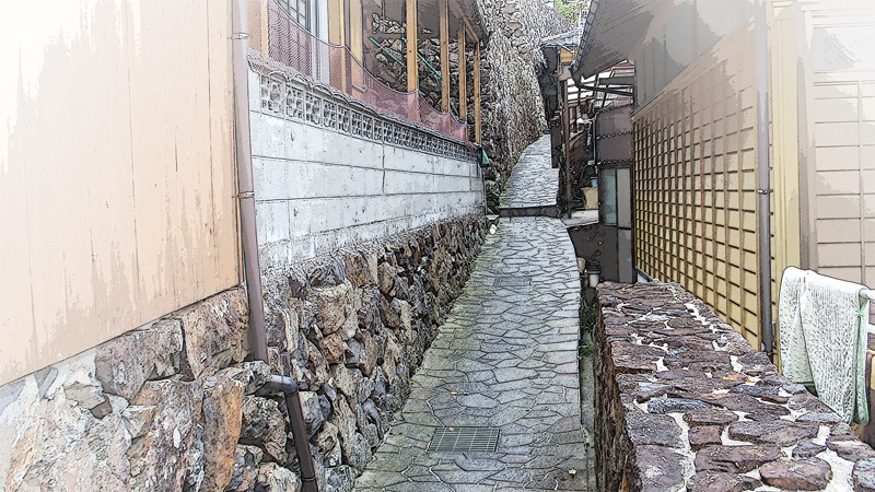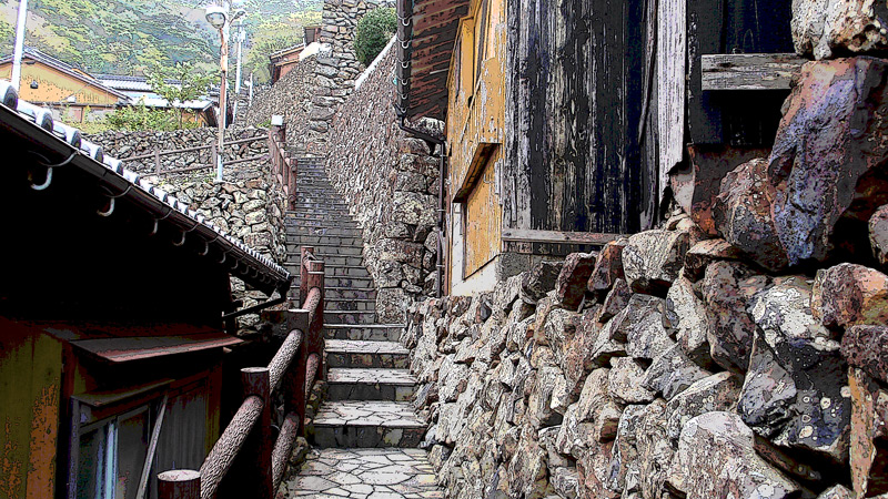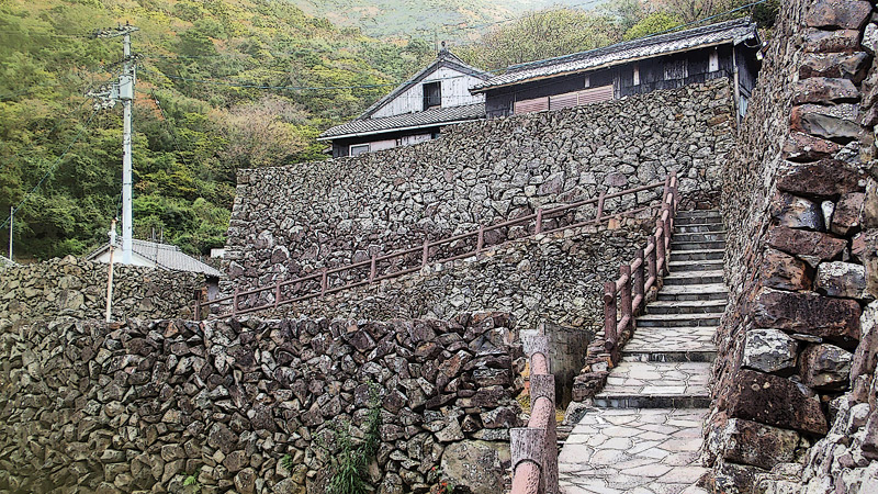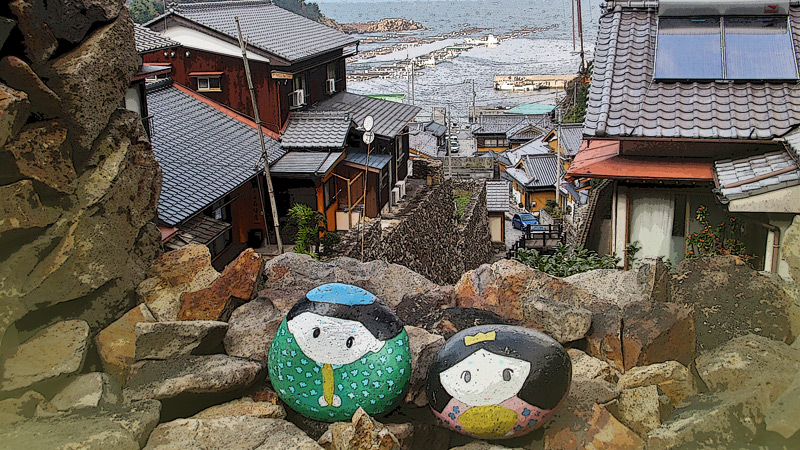 城壁か要塞かと思えるような石垣に民家が密集し、路地が網の目のように走る石垣の集落が「外泊」です。 外泊では春になると「だんだん雛祭り」を開催します。石垣の里の周辺の空き地に、手のひらほどの可愛らしい石雛達が展示されます。(3枚目の写真) 最初見た時は、子供が学校かどこかで作ったものを飾ったのかなと思い、かわいらしかったのでたまたま写真に撮りました。