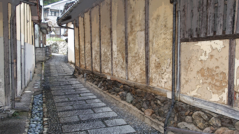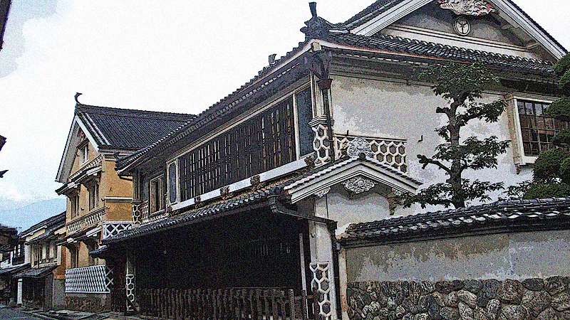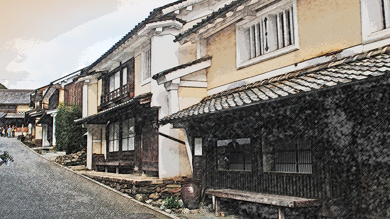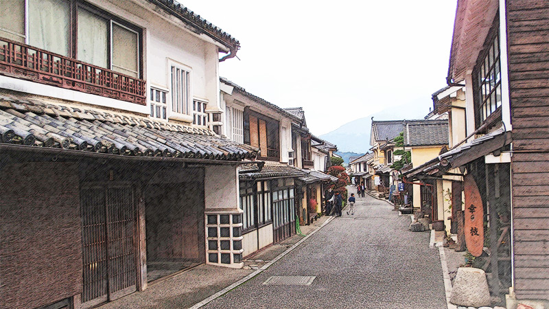 重要伝統的建造物群保存地区に選定されている街並みは、約600mの通りに伝統的な造りの町家や豪商の屋敷が、当時のまま軒を連ねています。 浅黄色の土壁が目につきます。この壁は、地元の土で塗られたもの。白漆喰と黄土が織りなすコントラストが特徴的です。